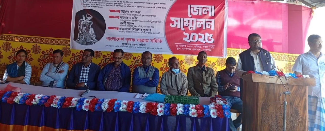 হাওরাঞ্চলের নদীগুলো অবিলম্বে খনন, ইজারা প্রথা বাতিল এবং সার-বীজ-কীটনাশকসহ সকল কৃষি উপকরণ নামমাত্র মূল্যে কৃষকদের সরবরাহ ও উৎপাদিত ফসলের ন্যায্য মূল্য নিশ্চিতকরণের দাবিতে কৃষক আন্দোলন গড়ে তোলার আহবান জানিয়েছেন কৃষক নেতারা। আজ শনিবার (২৯ নভেম্বর) বাংলাদেশ কৃষক সংগ্রাম সমিতির সুনামগঞ্জ জেলা সম্মেলনে এ আহবান জানান সংগঠনটির নেতৃবৃন্দ। সকাল ১১ টায় জেলার ধরমপাশা উপজেলার বাদশাগঞ্জ বাজারে এ সম্মেলন অনুষ্ঠিত হয়। সংগঠনের জেলা সভাপতি এডভোকেট নিরঞ্জন তালুকদারের সভাপতিত্বে জেলা সম্মেলন উদ্বোধন করেন জাতীয় গণতান্ত্রিক ফ্রন্টের সুনামগঞ্জ জেলা সভাপতি রত্নাংকুর দাস জহর।